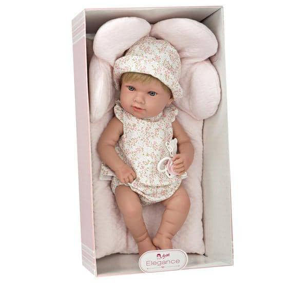 Bambola 42 cm con corpo in vinile, vestita con un delizioso outfit a fantasia floreale. Include ciuccio, materasso per culla e cuscino.