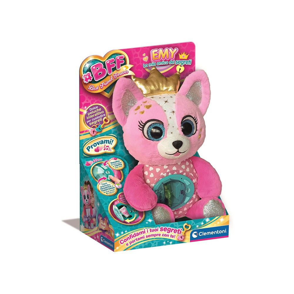 Un’amica speciale per custodire i tuoi segreti: BFF Emy La Mia Amica dei Segreti di Clementoni è un tenero peluche rosa interattivo con cuore luminoso e modulo elettronico, pronto ad ascoltare, custodire e condividere emozioni, pensieri e piccoli segreti.Gioca, parla e sogna con Emy: I bambini possono registrare fino a 5 messaggi vocali segreti, riascoltarli quando vogliono e nascondere bigliettini o piccoli tesori nel suo vano nascosto. Gli effetti luminosi colorati rendono ogni momento di gioco ancora più magico.Un’esperienza interattiva e affettiva: Premendo il cuore di Emy si attivano luci, suoni e funzioni di registrazione, trasformando il gioco in un’esperienza emozionale unica. La collana con chiave si trasforma in un braccialetto simbolo di amicizia e fiducia.Dolce, sicura e perfetta per i più piccoli: Realizzata con materiali morbidi e di alta qualità, Emy è ideale per accompagnare i bambini dai 4 ai 6 anni in momenti di gioco, condivisione e scoperta delle proprie emozioni.Un regalo perfetto per chi ama sognare: Parte della linea Crazy Chic BFF di Clementoni, Emy è molto più di un peluche — è una vera amica con cui parlare, giocare e crescere.