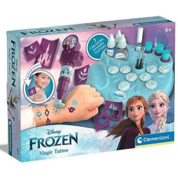 Un kit creativo per realizzare tattoo sensazionali ed esprimere la propria passione per Disney Frozen 2 mostrandola sulla propria pelle! Un laboratorio di tatuaggi completo di tutto l'occorrente per creare tattoo davvero originali: grazie all'innovativo strumento applica inchiostro e ai tanti timbrini inclusi nel gioco si possono riprodurre tatuaggi componibili in perfetto stile Disney Frozen 2! Inclusi nel kit anche tanti stencil, per riprodurre i simboli delle principesse Disney più amate e tattoo unici da personalizzare con il glitter. Il pratico banchetto di lavoro consente di avere tutti gli strumenti a portata di mano, la penna per tatuaggi dall'impugnatura ergonomica è semplice da utilizzare così le bambine possono giocare in completa autonomia. Contiene anche colori per il corpo per disegnare i tatuaggi a mano libera. I coloranti sono testati e sicuri per essere applicati sulla pelle ed i tatuaggi sono facilmente removibili con acqua e sapone. Un gioco Clementoni che stimola la creatività, la fantasia e la manualità delle bambine, consigliato a partire dai 6 anni.