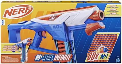 Nerf porta la sfida a un livello superiore con i nuovi blaster ad alte prestazioni Nerf N-Series e i dardi Nerf N1! Se già hai le capacità di un giocatore provetto, ora avrai anche a disposizione i blaster e dardi migliori di sempre, per vincere ogni tua sfida. Il blaster Infinite con dardi Nerf N-Series è dotato di un''innovativa catena da battaglia che ti consente di ricaricare i dardi velocemente e facilmente mentre stai giocando! Non dovrai più interrompere le battaglie per ricaricare! La catena rimovibile ha una capacità di 40 dardi grazie alla quale potrai sbizzarrirti a inondare il campo di gioco di dardi. Il blaster Infinite con azione a pompa include 80 dardi Nerf N1 in gommapiuma e dispone di un portadardi integrato da 16 dardi