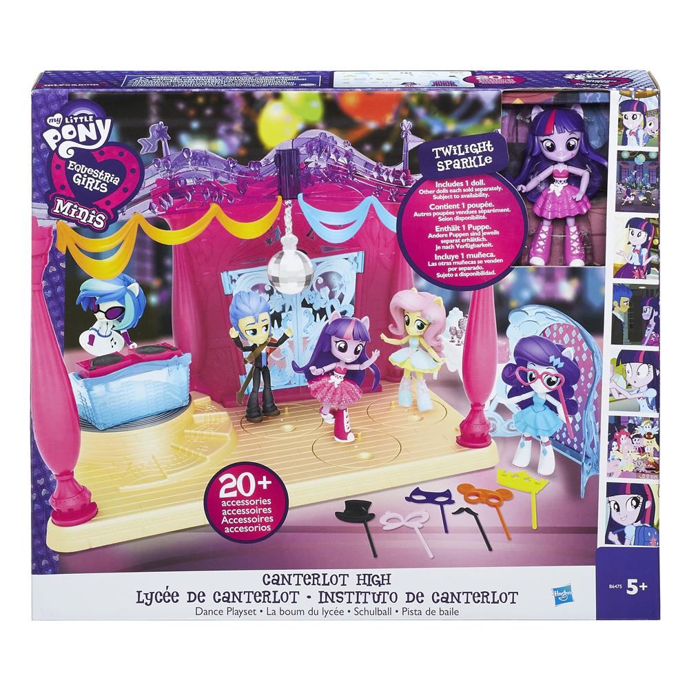 Al Castello di Canterlot si balla e ci si diverte tutta la notte! Questa favolosa discoteca ha tutto quello che serve: luci, la postazione del DJ, una zona per cibi e bevande, persino uno sfondo per le foto ricordo! Puoi mettere fino a 3 bamboline al centro del palco per vederle danzare ruotando e ridere felici! Il playset ha in dotazione Twilight Sparkle con un elegante abito da discoteca. Età: 5+ anni