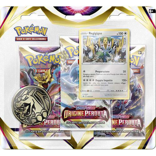 Ogni 3 Pack Blister dell'espansione Origine Perduta contiene:- 3 buste dell'espansione Spada e Scudo - Origine Perduta - 1 moneta Pokemon- 1 carta promo foil (Weavile o Regigigas)