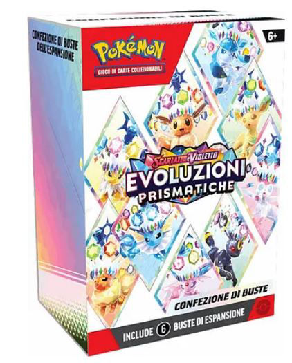 Contenuto: - 6 buste di espansione Scarlatto e Violetto - Evoluzioni Prismatiche del GCC Pokemon, ognuna contenente 10 carte, una carta Energia base e una carta codice per il GCC Pokemon Live. Colori astrali illuminano Eevee e i suoi amici! Gemme scintillanti e trame nascoste ti aspettano alla fine dell?arcobaleno nell'espansione Scarlatto e Violetto - Evoluzioni Prismatiche del GCC Pokemon! Manto morbido e spirito ardente, tocco glaciale e sembianze chimeriche: nel cuore degli Allenatori un posto speciale è occupato da Eevee e le sue evoluzioni! Questa utilissima confezione di buste di espansione che include 60 carte è un modo perfetto per arricchire la tua raccolta! Edizione in Italiano