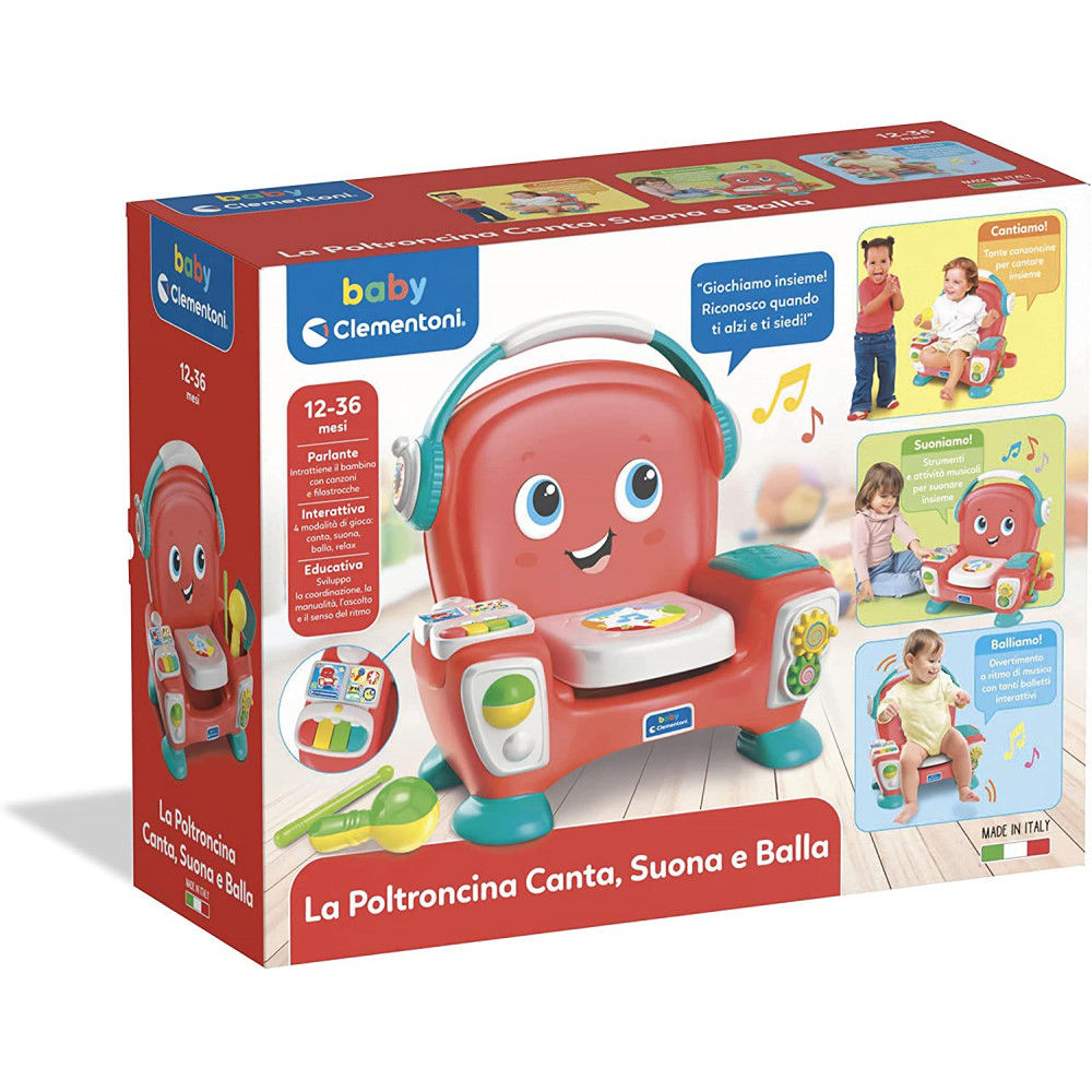 Una simpatica poltroncina multiattività e interattiva a tema musica, per far divertire i più piccoli a tutto ritmo! Per giocare, riposare, suonare e cantare, imparando le parole, numeri e colori. Ricca di strumenti musicali è dotata di una maraca, di una bacchetta per suonare il tamburo, una pianola e di una mini consolle con pulsanti touch e uno schermo luminoso. Lo speciale sensore della seduta riconosce quando il bambino si siede e propone musiche coinvolgenti e balletti interattivi, invitandolo a giocare in movimento. La Poltroncina Suona Canta e Balla ha tantissime funzioni per interagire con suoni, musiche, canzoni e parole, ed è ricca di attività meccaniche per giocare, suonare e sviluppare la manualità. La funzione Balla propone canzoncine interattive, come il ballo della poltroncina, che invita il bambino ad alzarsi, ballare intorno alla sedia e sedersi prima che finisca il conto alla rovescia. La funzione Suona guida il bambino nell'utilizzo della pianola usando i colori dei tasti, per un primo approccio con la musica. Se si gioca con la funzione Canta il bambino è invitato a cantare insieme alla poltroncina una semplice canzone che stimola la lallazione. E con la funzione Relax tante coccole e dolci melodie. Un gioco elettronico parlante ideale a partire dai 12 mesi. Made in Italy.