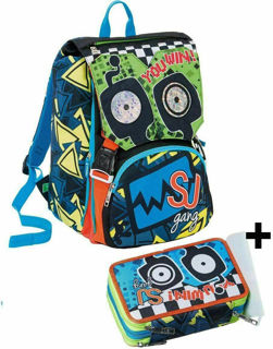 Set di ZAINO ESTENSIBILE + ASTUCCIO 3 ZIP ATTREZZATO: FACCE BOY - AZZURRO della linea SJ GANG, di Seven.ZAINO:Ciao!!! Io sono molto più di uno zaino!Il mio già grande doppio scomparto si moltiplica grazie alle zip laterali per accogliere in modo ottimale tutto quello che ti serve per scuola, anche quando il carico si fa pesante, sfruttando pure l’ampia tasca frontale e quella sulla pattina.E con lo schienale Ergosystem preformato con fondo integrato e gli spallacci imbottiti e rivestiti in tessuto e rete traspirante sono confortevole da indossare, ti salvaguardo la schiena e proteggo il contenuto che mi hai affidato.Ma a rendermi speciale è il mio Flip System, il sistema con le pattine calamitate!Puoi divertirti con i tuoi amici a trasformami da tigre a coccodrillo e viceversa ogni volta che vuoi!E ho gli occhi olografici! Forte, eh?Io per te posso essere un amico sicuro, affidabile e pieno di sorprese ed energia!Cosa aspetti? Entra con me nella SJ GANG e diamo inizio al divertimento!Capacità: 21 LT chiuso - 28 LT aperto.Dimensioni: chiuso 27x41x16 cm - aperto:27x41x22 cm.Funzionali: zaino doppio scomparto estensibile tramite zip laterali - Flip System: due diverse pattine calamitate e occhi su pattina principale in materiale olografico con dettagli stampati - fantasia all-over.Garanzia: 4 anni.Schienale: in ERGOSYSTEM preformato con fondo integrato.Spallacci: imbottiti e rivestiti in tessuto e rete traspirante.Tasche: frontale con zip e su pattina.Tessuto: polyestere.ASTUCCIO:Soltanto materiale la cui qualità è offerta da SJ GANG come la penna cancellabile blu Pilot Frixion Ball, la penna a sfera rossa Fila Tratto 1Uno Grip, i 18 pennarelli Giotto Turbocolor, i 18 pastelli a colori Giotto Supermina, la matita grafite Lyra Temagraph, la colla stick Pritt e tutto il resto!